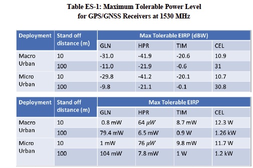 The report gathers together results and adds details on how the study team arrived at interference tolerance masks (ITMs) — that is the maximum level of power a GPS receiver can tolerate from a device in an adjacent band at different frequencies. The tests focused on an LTE signal (i.e. 4G mobile telecommunications) with researchers assessing the impacts of signals from large (macro) and small (micro) LTE cells in the urban areas. Macro cells comprise of a cell tower about 25 meters high with a cell radius of 0.25 to 1 kilometer. Urban micro cells were assumed to have 6-meter antennas and there could be one to three per macro cell. They also looked at macro cells in rural areas.