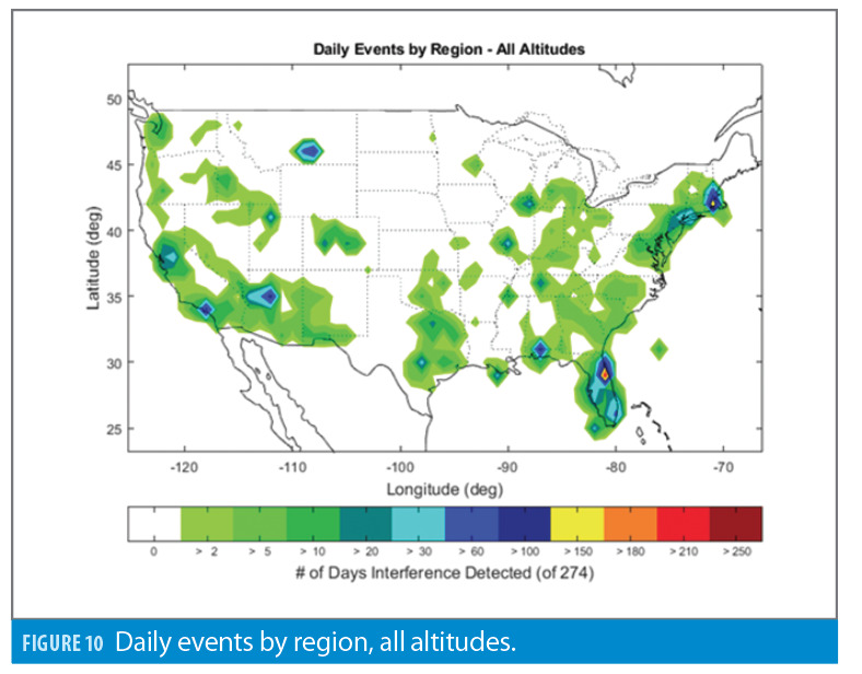 Figure 9 also depicts interference events above 20,000 feet in red. Twenty-thousand feet filters out most general aviation aircraft and is used to validate the assumption that most interference sources are terrestrial based.
