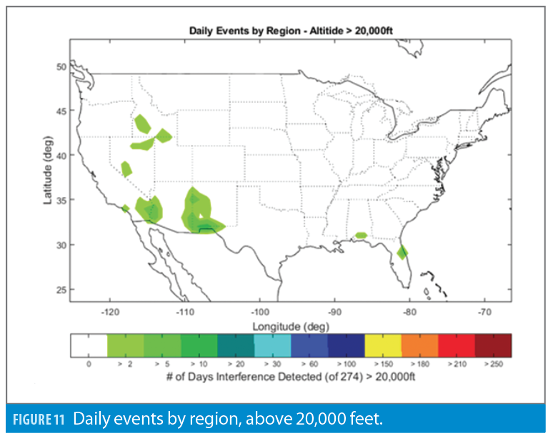Figure 11 shows the same daily occurrence information for all interference events detected above altitudes of 20,000 feet, filtering out most general aviation flights, approach and departure flight phases, and potentially highlighting regions with higher power interference.