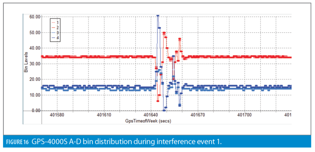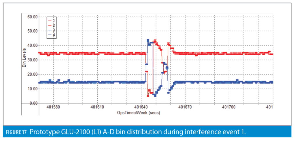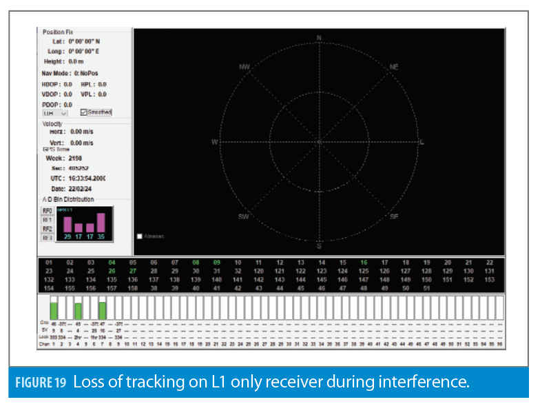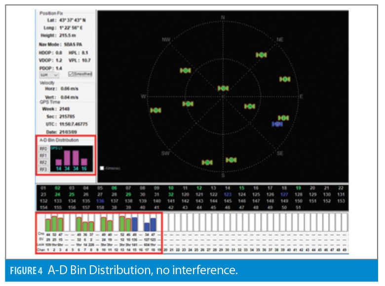 Figure 5 shows the same information at an epoch seven seconds later when RF interference is encountered. At this time, the A-D bin distribution is inverted, or non-Gaussian, and the receiver lost track of four GPS satellites and two SBAS satellites due to the in-band RF interference. This A-D bin distribution behavior gets logged as an indicator of RF interference on both GPS-4000S (-1xx) and GLU-2100 products.