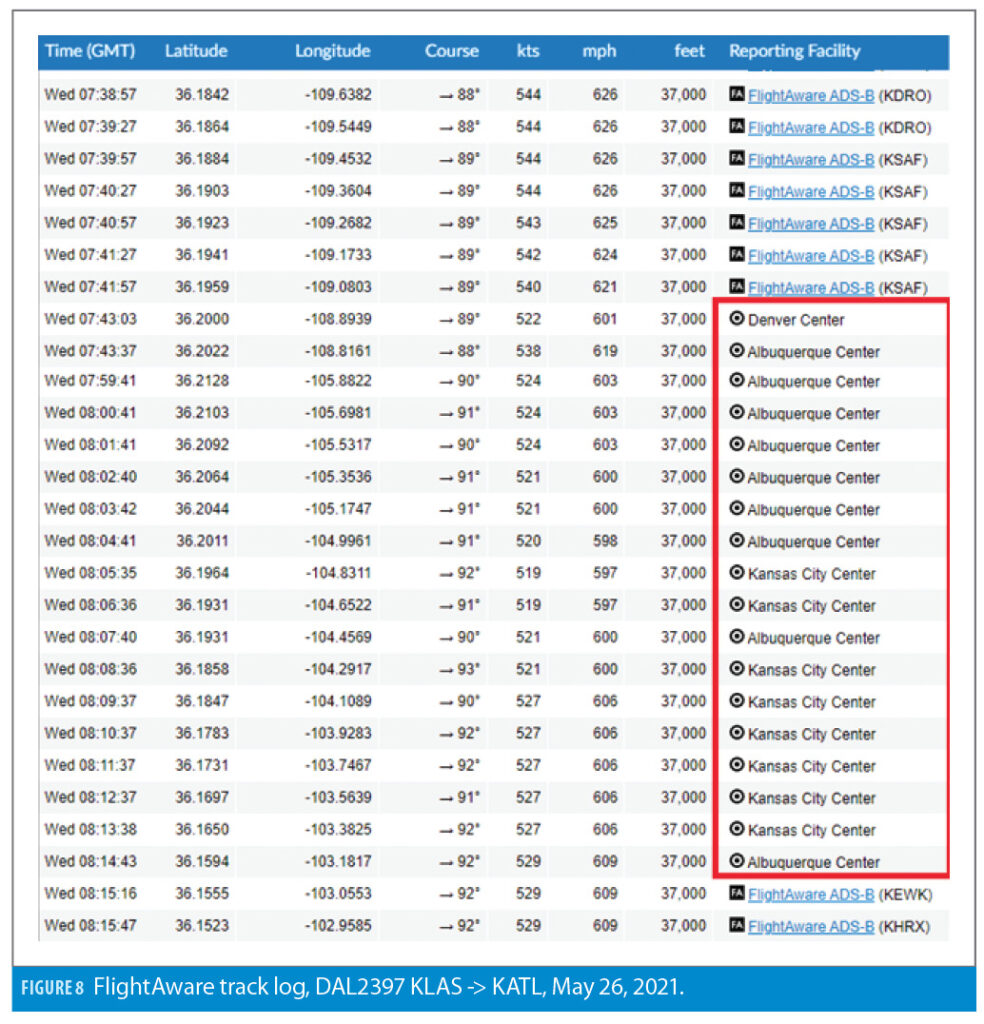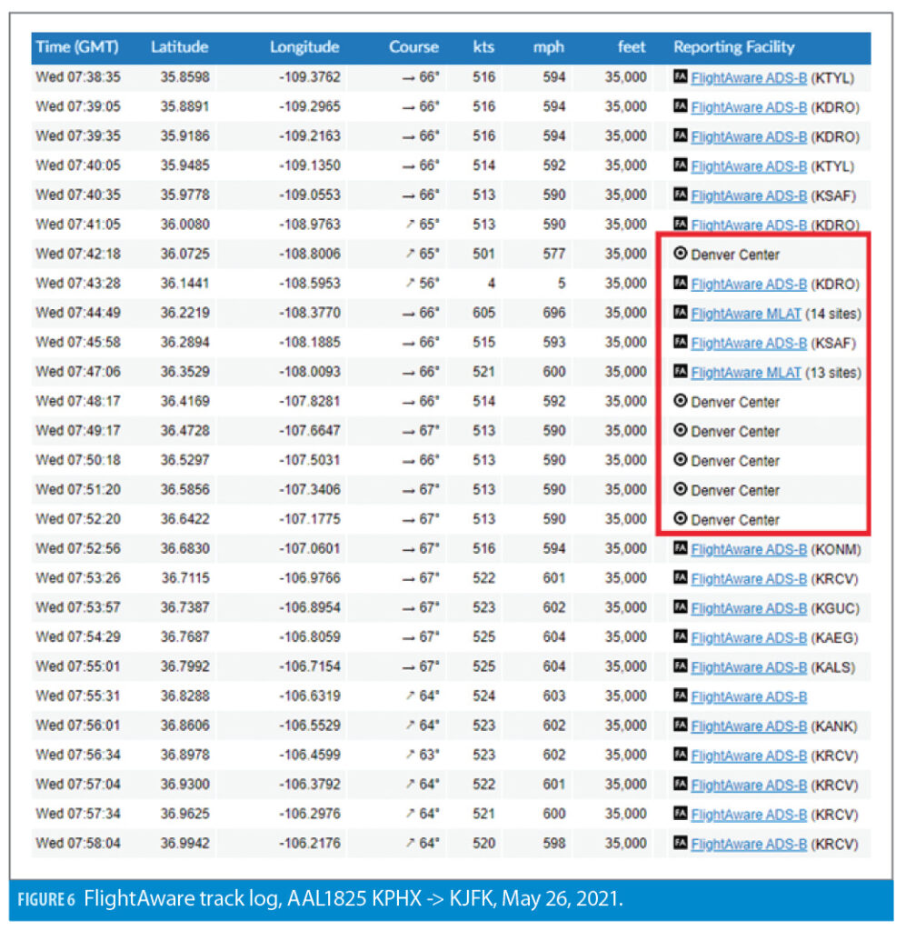 FlightAware fuses aircraft position reports from multiple sources and prioritizes ADS-B Out position reports as the highest priority. ADS-B Out drops can be observed using FlightAware’s web-based flight tracker through the “Reporting Facility” or “Report Update Type.” Figure 6 shows an example flight from the web interface, which experienced an ADS-B Out drop. On this example flight, American Airlines flight 1825 from Phoenix (KPHX) to New York (KJFK) on May 26, 2021, lost ADS-B Out for approximately 10 minutes over the New Mexico and Arizona state border while cruising at 35,000 feet. During the loss of ADS-B Out, FlightAware’s position reports are based on ground radar (Denver Center) and Multilateration (MLAT) sources.