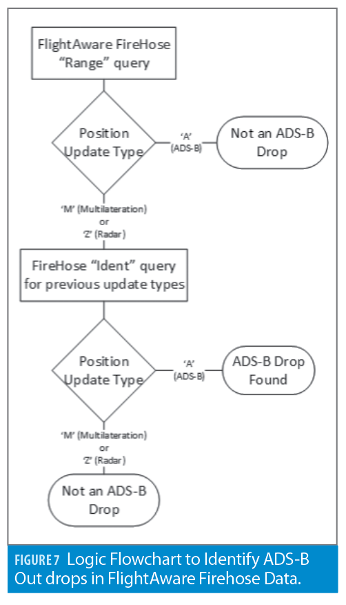 All ADS-B Out drops, such as the example shown in Figure 6, were identified for the entire nine month period over the CONUS. The logic of identifying ADS-B Out drops was automated by querying FlightAware’s Firehose API commands using python scripts to automate the process identified in Figure 7.