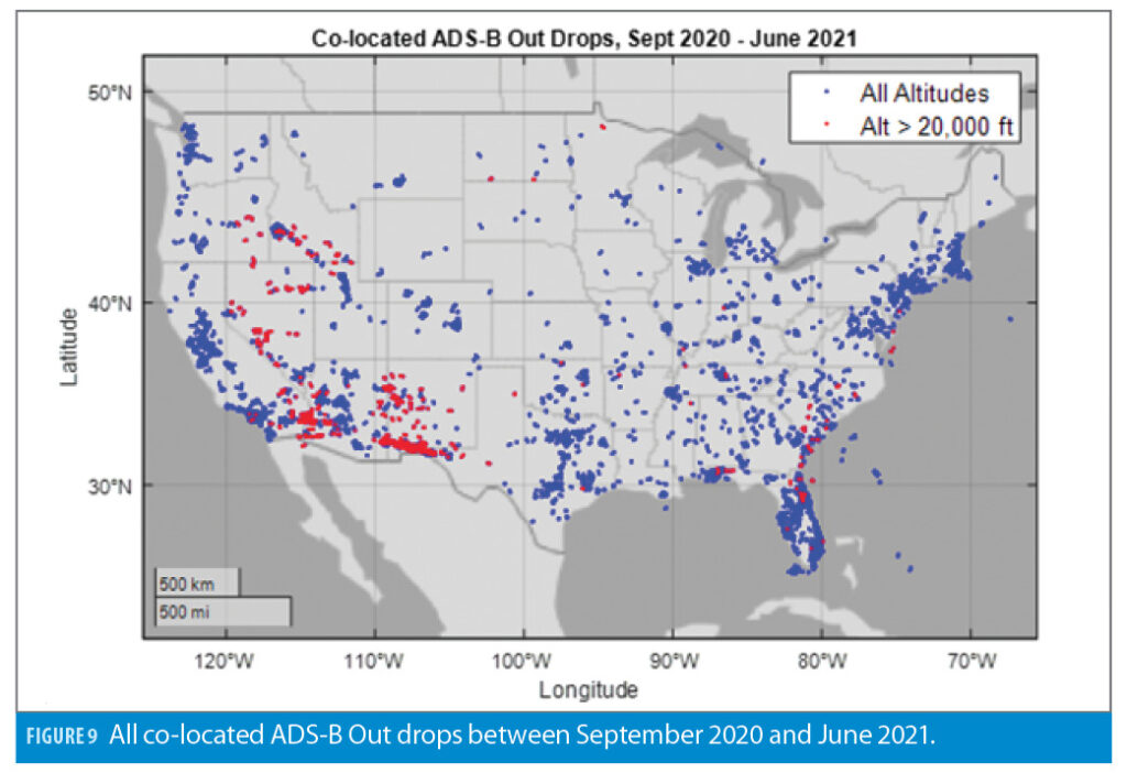 Using the described method, approximately 8,500 interference events were identified over the CONUS during the nine month period from September 2020 through June 2021, each event requiring at least two co-located ADS-B Out drops. The analysis included all commercial, business, cargo and general aviation flights that were equipped with ADS-B Out. Figure 9 shows all nine months’ worth of co-located ADS-B Out drops, or approximately all 8,500 interference events identified using the method described. This figure alone can be misleading for a number of reasons: