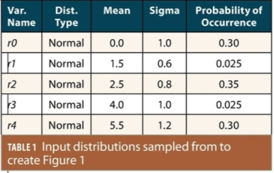 For illustration, Figure 1 shows the histogram (in PDF form) of a data set generated by Monte Carlo sampling from multiple Gaussian distributions with different means in the manner conducted in Part I. Table 1 shows the five Gaussian distributions sampled from and the probability that applies to each, meaning that each of the 10 million samples collected has that probability of being taken from the corresponding Gaussian distribution. Since four of the five distributions (all but r0) are biased in the positive direction by different amounts, the resulting distribution is not symmetric. In addition, because two of these distributions (r2 and r4, with means of 2.5 and 5.5, respectively) have similar probabilities of occurrence as the unbiased distribution, two humps appear at those bias values and prevent unimodality (with the hump from r2 being the highest).