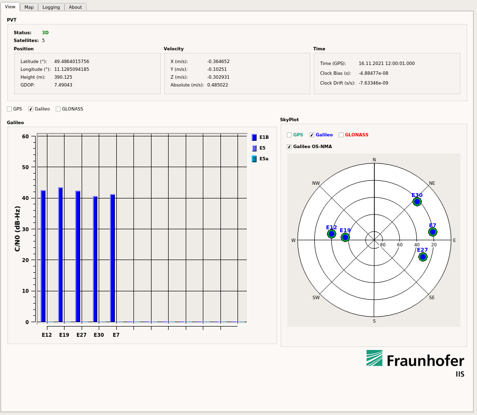 The screenshotsbelow shows authentication of Galileo satellites only (all pictures ©Fraunhofer IIS).