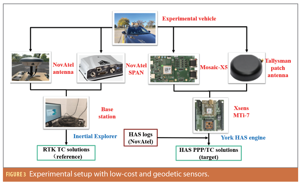 To evaluate the effectiveness of HAS corrections and the performance of the York PPP engine, a series of vehicular experiments were conducted in the vicinity of York University, Toronto, Canada. The experimental configuration, depicted in Figure 3, consists of two data collection setups: 1) The geodetic collection employs a NovAtel SPAN (comprising an OEM7 GNSS receiver and Epson IMU) integrated with a NovAtel antenna. 2) The low-cost collection equipment comprises a Septentrio Mosaic-X5 receiver paired with a Tallysman patch antenna. Furthermore, an automotive-grade Xsens MTi-7 IMU is affixed on top of the experiment vehicle. The HAS log files, decoded by NovAtel, are used as input data for the York PPP engine to generate HAS PPP/TC solutions. Additionally, a base station using a NovAtel OEM7 receiver and a geodetic-grade antenna is mounted on an open rooftop within a 5 km baseline length to provide the reference trajectory processed by the NovAtel Inertial Explorer software.