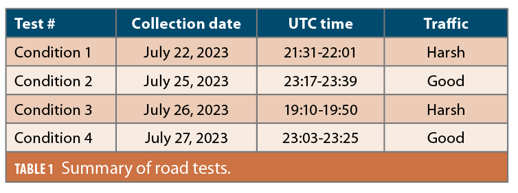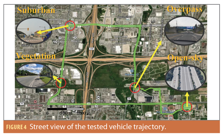 To simulate daily driving environments, four kinematic tests were conducted on different days with a similar route and different multipath profiles. Table 1 highlights the corresponding details of the four vehicle experiments, including test identifiers, collection dates, UTC timestamps, and traffic conditions. Note the traffic conditions fluctuated at different local times, primarily due to variations in traffic volume and traffic density.
