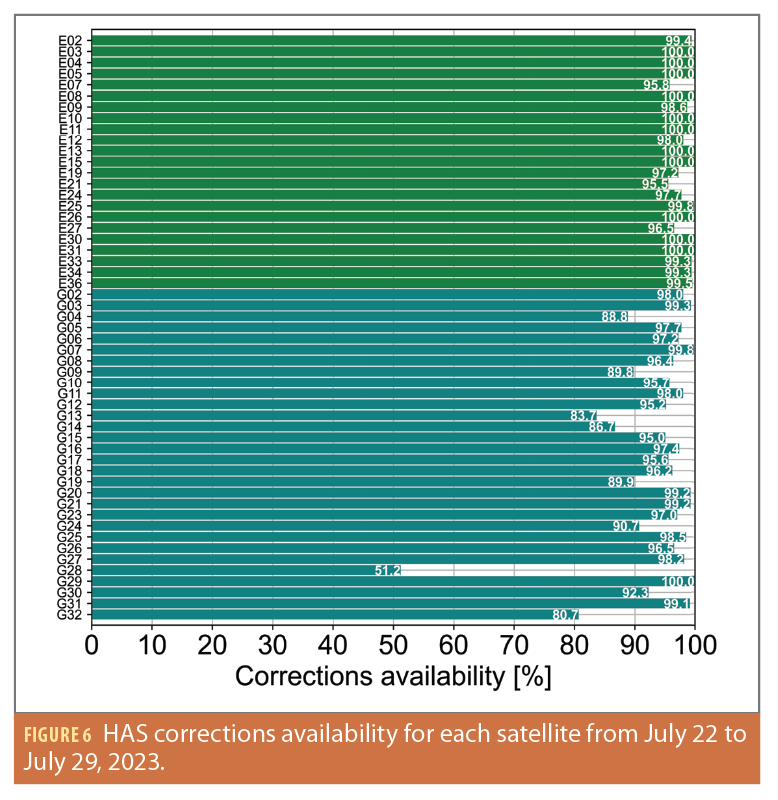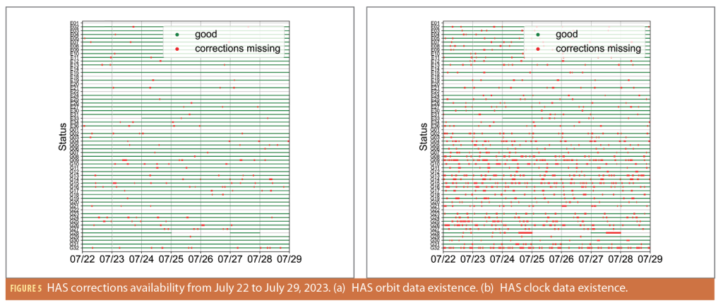 The results presented focus on the assessment of HAS corrections data availability over a one-week period, from July 22 to July 29, 2023. Considering the HAS orbit and clock corrections are provided with distinct timestamps, their availability is initially examined separately. As shown in Figure 5, green regions denote the presence of corrections accessible to users, while red dots represent instances where HAS corrections were unavailable during those time intervals. Note these results exclusively account for the existence of corrections, without taking into account their validity periods. Both Galileo and GPS exhibit a high degree of HAS orbit availability, with Galileo achieving close to 100% availability, and GPS at ~98%. In contrast, HAS clock availability is somewhat lower, with Galileo achieving 99% availability and GPS satellites attaining 92% availability.