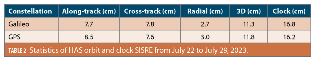 Figure 8 presents an overview of the average orbital SISRE (represented in green) and total SISRE (represented in purple) for both Galileo and GPS satellites over one week. Owing to unexpected larger errors, G07, G09 and E33 satellites have been excluded from the computation and deserve further investigation. Additionally, Table 2 highlights the overall statistics, indicating HAS is capable of providing orbital and clock corrections with SISRE values of approximately 11 cm and 16 cm, respectively. These accuracy levels are consistent with those observed in 2022 [14].