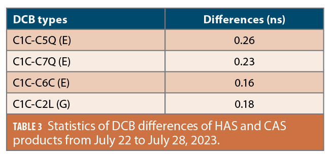 between HAS and CAS products are at the sub-nanosecond level. This analysis aligns with the previous conclusion that HAS OSB accuracy remains consistent with the levels observed in 2022 [14].