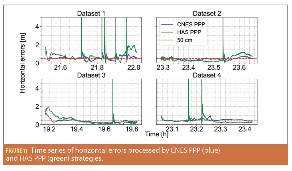 A comparative analysis was conducted between HAS corrections and the ultra-rapid products provided by CNES. To ensure an equitable comparison, the DCB values provided by CAS are also taken into consideration when processing CNES PPP solutions, and the satellite orbit, clock and code bias corrections are applied for both GPS and Galileo constellations and processed in the same dual-frequency uncombined mode. Float solutions were examined as HAS satellite phase biases are currently not transmitted to users. Figure 11 presents the time series of low-cost PPP horizontal errors for datasets 1 to 4. The PPP solutions generated by CNES and HAS products are illustrated by blue and green lines, respectively. The red dashed line indicates the convergence threshold. Defining a precise convergence threshold in dynamic environments with frequent signal loss and filter initialization can be challenging, so a more lenient convergence threshold of 50 cm was set.