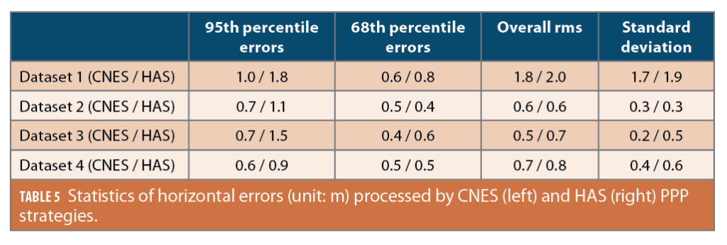 Table 5 presents a comprehensive analysis of the 95th percentile errors, 68th percentile errors, overall rms, and standard deviation for CNES (left) and HAS (right) PPP solutions throughout the datasets. CNES PPP solutions show superior accuracy and stability compared to HAS PPP solutions, primarily due to the higher availability of satellites in CNES corrections. When focusing on the 68th percentile horizontal performance, where an adequate number of satellites are available for GNSS processing, HAS PPP provides comparable positioning performance to CNES ultra-rapid PPP solutions. CNES PPP solutions generally have better performance than HAS PPP, but the results show the potential of HAS corrections in mass-market applications requiring precise navigation.