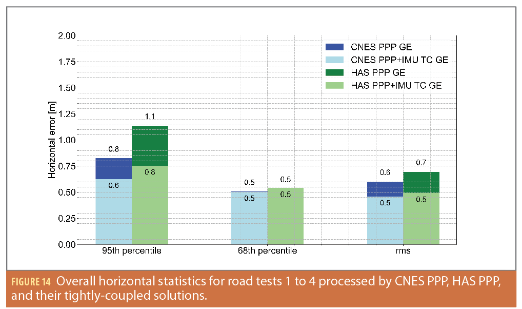 The inclusion of the low-cost IMU leads to several important insights. First, the TC solutions do no harm to GNSS-only solutions when a sufficient number of satellites are available. Furthermore, TC solutions play a pivotal role in significantly mitigating positioning errors during GNSS outages, enhancing the robustness of positioning systems in challenging environments. Most notably, the integration of TC solutions effectively narrows the performance gap between using HAS and CNES corrections, leading to a remarkable achievement of 0.5 m rms for horizontal positioning performance, even in challenging environments.