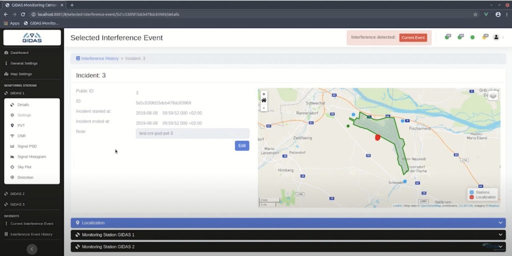 For safety-critical applications with high demands, the system is capable of estimating the interference location in 2D by joining several (at least three) monitoring stations. The system is fully user configurable through a dedicated graphical user interface and provides an alarm functionality in case of interference appearing to be intentional. All detected interference events are stored in a database together with a digital signal snapshot for post-processing and inspection purposes.