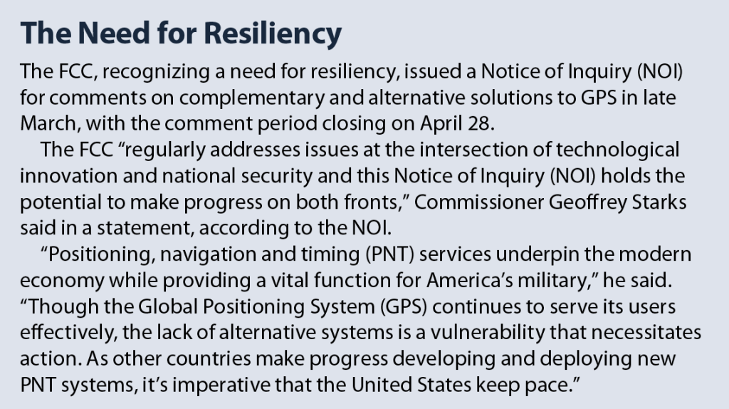 While many members of the PNT community are heartened by the FCC’s interest, some have observed that the agency’s authorities and responsibilities are not well positioned to address national PNT resilience on its own. They have urged for a whole-of-government approach in concert with the administration and Congress.This and other recommendations were included in a response to the NOI submitted by the Resilient Navigation and Timing Foundation.