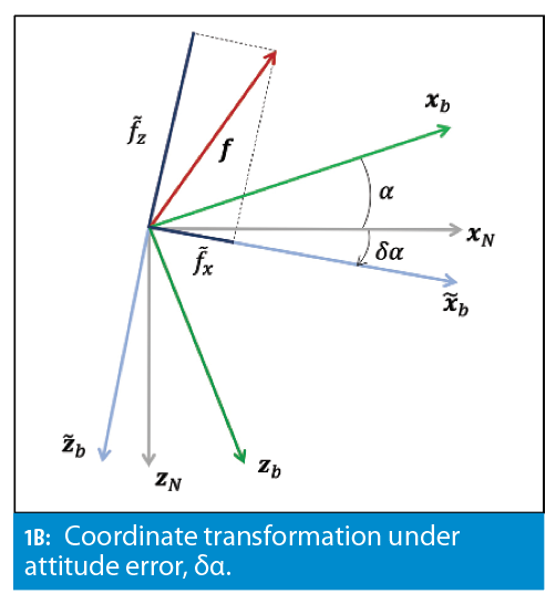 In Figure 1(a) the relative angle, α, between the body-frame (xb, zb) and the navigation frame (xN, zN) is perfectly known. In this case, body-frame non-gravitational acceleration is translated exactly into its navigation frame components, ax and az. When gyro bias, bgyro, is present, it is integrated into the attitude error, δα, during the attitude determination step: