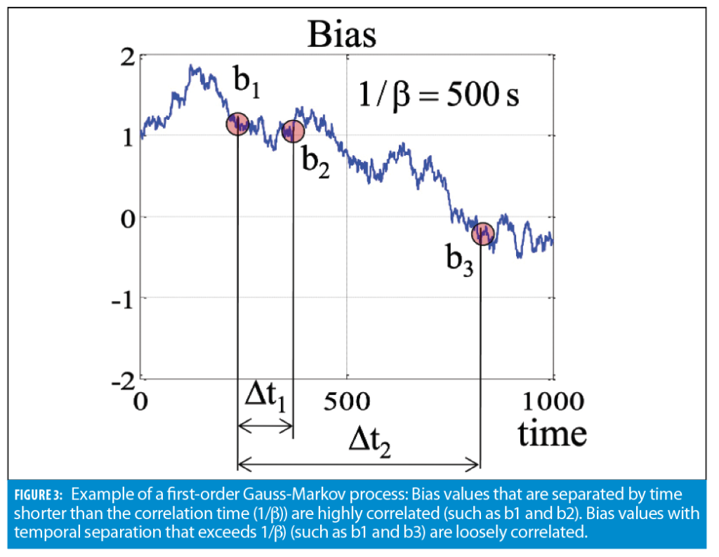 Approximation of accelerometer and gyro measurement errors by a constant bias is good for providing an insight into the key principles of INS error growth. Yet, for practical cases, it is too simplistic even for low-grade MEMS sensors. More adequate modeling of sensor measurement errors includes slow-varying bias and noise terms. Noise is represented by a zero-mean Gaussian random process. Slow-varying time bias is approximated by the first-order Gauss-Markov process. This process has an exponential autocorrelation function: