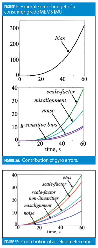 This final section provides two examples of the INS error budget. The first example is shown in Figure 5 for a consumer-grade INS. Stand-alone inertial functionality over a 1-minute interval is considered.
