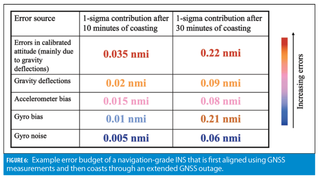 contributor into the INS error budget after 10 minutes of coasting. Their contribution becomes more balanced with the gyro drift after 30 minutes of GNSS-denied operations. Nevertheless, in this example case, improving INS sensor performance will not significantly improve the overall system accuracy because the gravitational model has to be improved first.