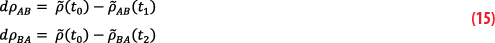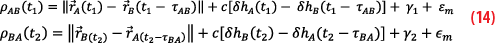 At epoch t1 in the proper time of satellite A, satellite A performs with the satellite B a pseudo-range measurement ρAB (t1). During the next sub-slot, satellite B measures the pseudo-range ρBA (t2) with the satellite A at epoch t2 of its proper time. These measurements, which correspond to different epochs, are shared (each satellite measures the forward ranging ρ: AB and receives the backward ranging ρ: BA) and can be written as: