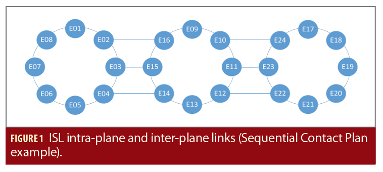 The ISL contact plan envisaged for this experiment are of the point-to-point (“unicast”) type and “sequential,” enabling communication between pairs of satellites, in half-duplex mode either intra-plane or inter-plane (respectively, between satellites on the same orbital plane and on different orbital planes) during repetitive cycles. In a Sequential Contact Plan, a given satellite tries to establish ISL communication to all satellites one after the other. This is done following a fixed matrix, independently of the distance or other parameters that might affect the link itself.