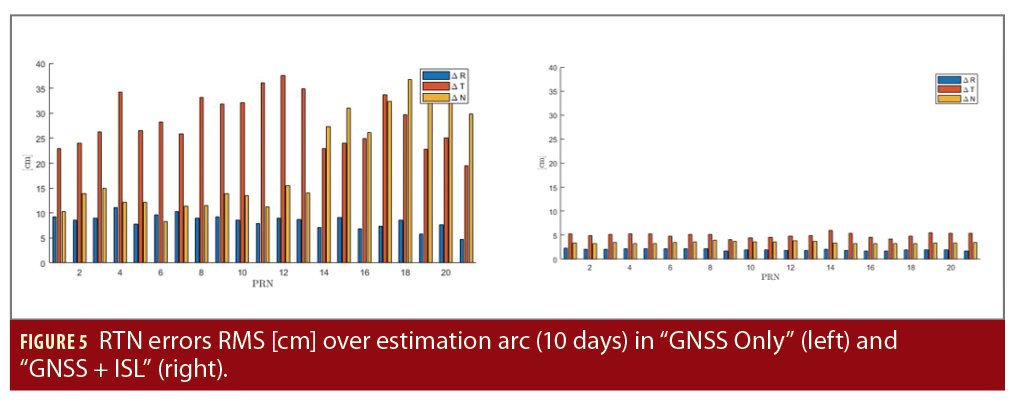 Figures 5 and 6 show ISL observables drastically improve the observability of all main directions, both in-plane and out-of-plane components. The ISL lines of sight make the geometry significantly more favorable. The clock errors are reduced because the filter can more easily separate orbital errors along the radial direction from the clock bias errors. The RMS on the 3D positioning errors during estimation is below 7 cm when including ISL ranging and Doppler within the filter (with all hypotheses made over the ISL noise).