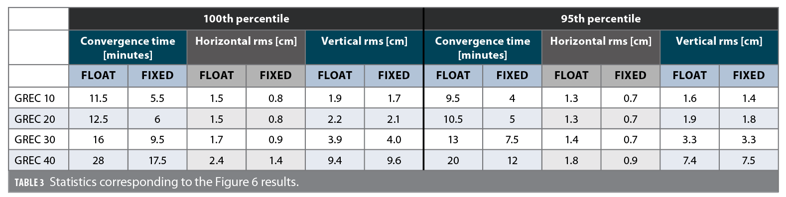 Figure 6 and Table 3 highlight the performance of the float and fixed, obstructed and unobstructed GREC solutions at the 100th and 95th percentiles. As stated earlier, GLONASS has been processed without ambiguity resolution in the fixed GREC solutions.
