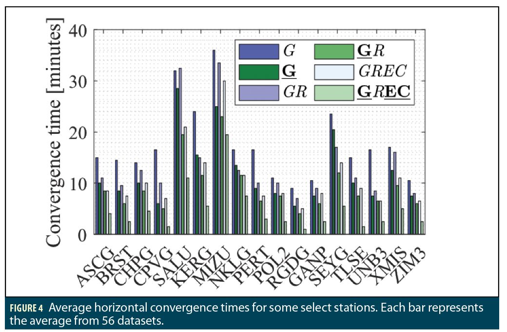 Figure 4 gives examples of the convergence time behavior of some select stations that were used for the generation of the Figure 3 results. For most datasets, a fixed GPS solution converges faster than a float GR solution, and a fixed GR solution converges faster than a float GREC solution. For some datasets, the fixed GPS solutions converge faster than the float GREC solution, but those datasets are exceptions. These results indicate that there can be more benefit to implementing AR on a few select constellations, as opposed to processing more satellites, or even expanding the constellations with more satellites. Naturally, a GREC fixed solution has a better behavior than all other solutions, as it adds robustness to the fixing and greatly reduces the convergence time for all datasets.