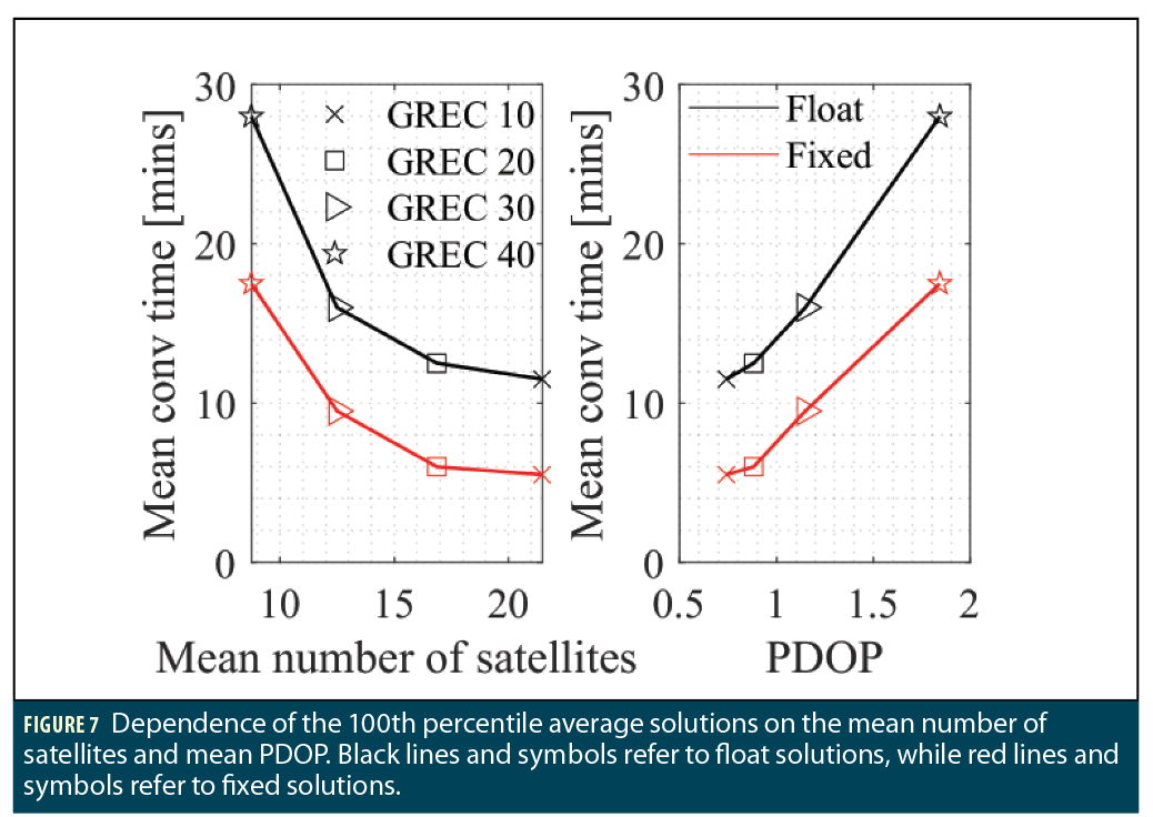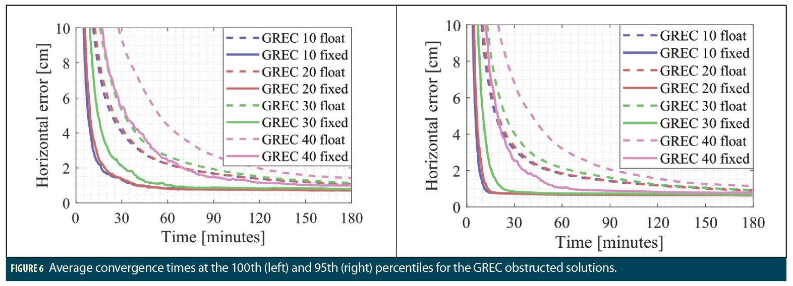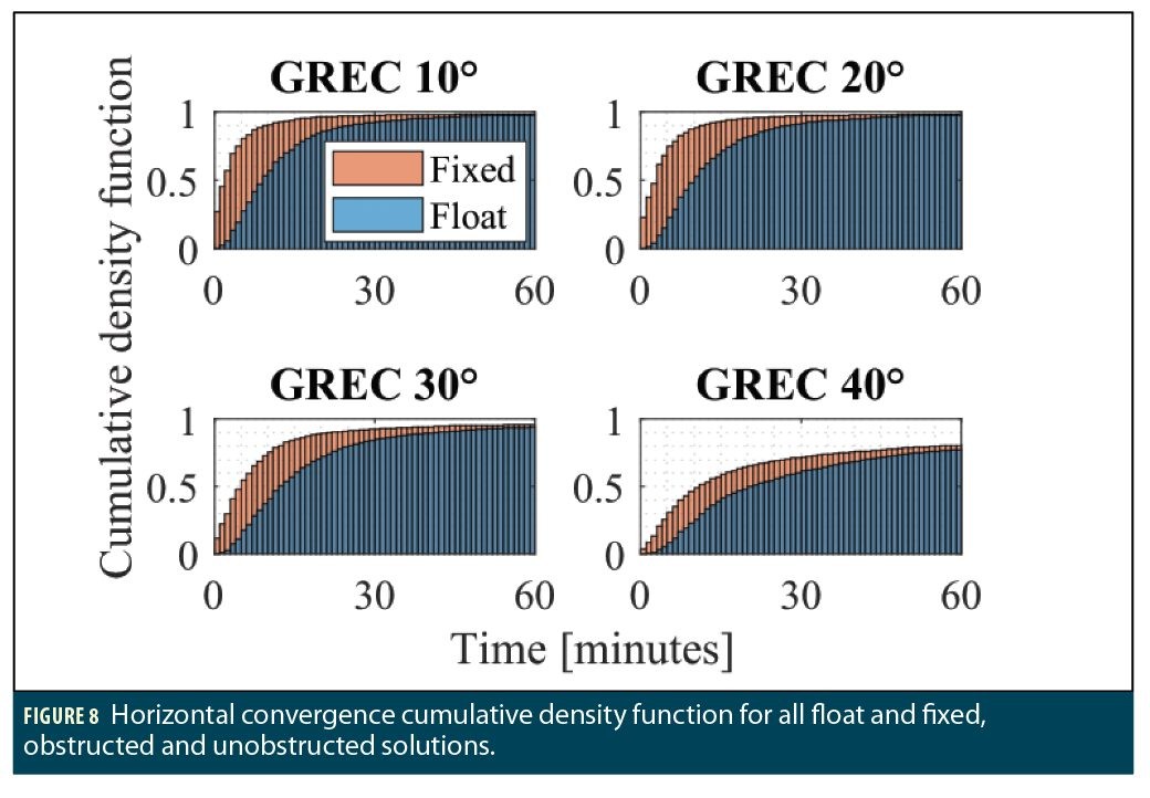 On a brighter side, it is promising to see that even with at a 30° elevation angle threshold, the fixed solution is able to converge faster than the unobstructed solution, both at the 100th and 95th percentiles. When it comes to the GREC 40 solution, at the 100th percentile, even though there is a big improvement compared to its float counterpart, the solution’s convergence time is only comparable to the float GREC 30 solution. However, it is interesting to note that, at the 95th percentile, the GREC 40 fixed solution is much closer to the GREC 10, GREC 20 and GREC 30 float solutions, being only 2.5, 1.5 and 1 minute away, respectively. The fixed GREC 40 solution on the other hand converges at a time between the GREC 20 and GREC 30 float solutions.