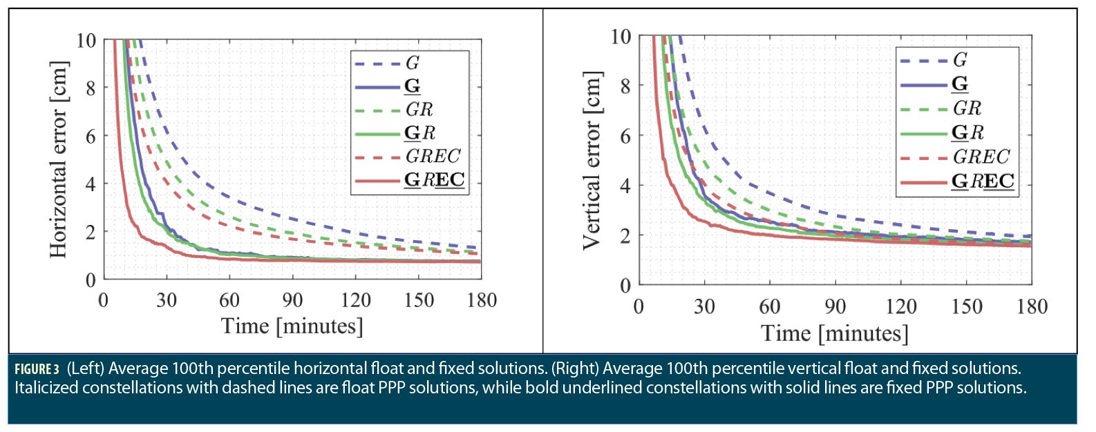 The impact of the PDOP on the PPP solutions can be seen in Figure 3. The figure shows the 100-percentile average based on all datasets for the different constellation combinations. The dashed graph lines represent the float solutions and the solid ones are their fixed counterparts. Table 2 contains the convergence time and rms for each graph in Figure 3. The convergence time is defined as the time it takes for the solution to settle below 10 cm horizontal error or the time at which the horizontal error graph line appears in the figure. The horizontal and vertical rms are computed between minutes 60 and 180 to assess the final accuracies after convergence.