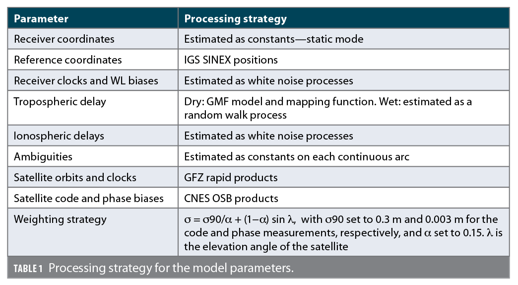 Table 1 shows the processing strategy that was adopted for the different parameters of the model. Besides the estimated parameters, external corrections are used. The satellite code and phase biases, vital for successful PPP-AR, have been corrected for using the CNES Observable-specific Signal Biases (OSB). These biases are provided and applied at the observable level, and they do not require prior knowledge of the method that was used to estimate them on the network side. The OSBs are used together with the GFZ rapid orbits and clocks to maintain compatibility. Both the satellite Phase Center Offset (PCO) and the Phase Center Variation (PCV) are corrected for using the IGS ANTEX file. Other corrections, such as phase wind-up, relativistic effect and Earth rotation are also corrected for following the IERS convention.