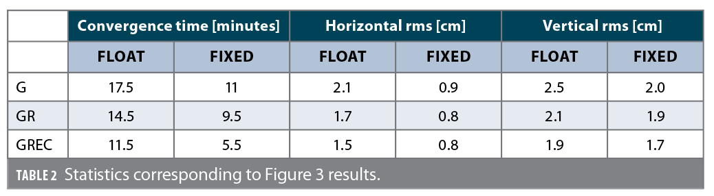 Looking at both Table 2 and Figure 3, it is obvious that AR has a significant impact on solution convergence and accuracy, regardless of the constellation combination. The fixed solution consistently converges faster than the float one and is able to reach higher accuracies. It is interesting to notice that the fixed solutions with fewer constellations can converge faster than float solutions with more constellations. For instance, the fixed G solution converges 3.5 minutes faster than the GR float solution and is able to reach 49% better horizontal accuracies, respectively, even though GLONASS adds an average of 6 additional satellites. The same conclusion holds for the fixed GR solution compared to the float GREC solution. It is worth noting that, in this case, even the GPS- only fixed solution converges half a minute faster than the full float GREC solution, even though the latter has 13 more visible satellites and over half the PDOP of the former. The horizontal accuracies are also smaller in the fixed GPS solution, 0.9 cm, compared to all the float solutions, 2.1 cm, 1.7 cm and 1.5 cm. However, the latter conclusion does not hold all the time, as these results are based on averaged results from multiple datasets.