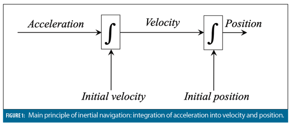 The key concept of inertial navigation originates from the first two laws of Newtonian physics. The first law states that an object will continue to move with a constant velocity unless disturbed by an external force. According to the second law, a non-zero net external force will result in an acceleration in the same direction with that force, and inversely proportional to the mass of the object. Hence, if we can measure the external force, it can be directly related to acceleration. Figure 1 shows how acceleration can be then integrated into velocity and position.