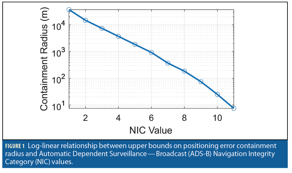The government, industry and academia have been investigating this and other jamming events, including under the Department of Defense (DoD)’s Defense Innovation Unit (DIU) Harmonious Rook effort [5]. An effective means to evaluate the spatial and temporal scope of wide-area jamming is using readily deployed ADS-B transmitters. ADS-B has been mandated on all U.S. aircraft since 2020. ADS-B is an air traffic management tool that requires all aircraft to communicate their position estimates, which are primarily based on GPS. These estimates have GPS quality indicators including the Navigation Integrity Category (NIC). Figure 1 illustrates the log-linear relationship between NIC and containment radius, which is a probabilistic bound on horizontal positioning errors; the smaller the NIC value, the larger the containment radius.