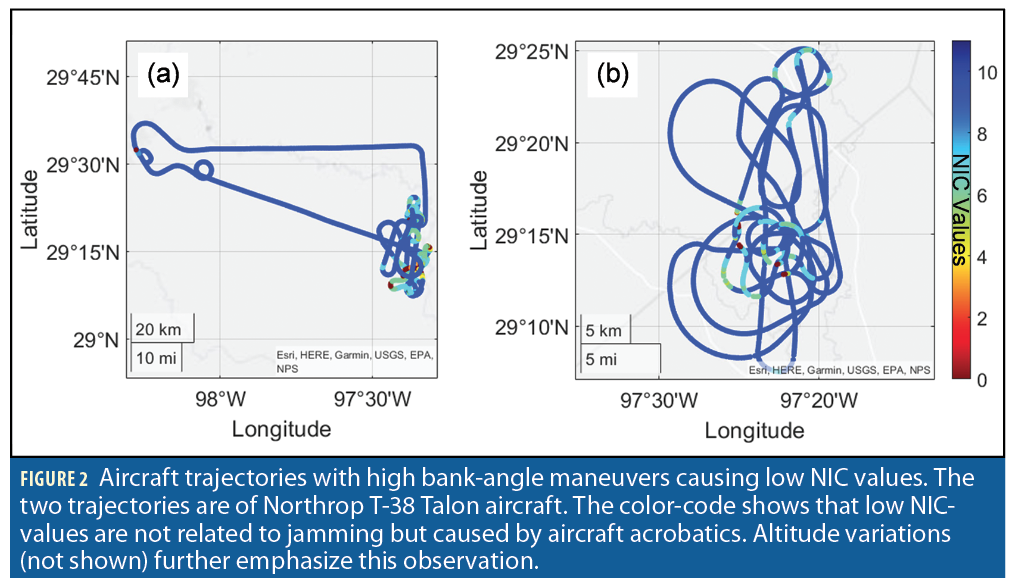 1. Jamming causes low ADS-B NIC values, but it is only one among many causes for low NIC. For example, aircraft banking during flight training maneuvers causes poor GPS performance and hence low NIC. High-dynamic aircraft maneuvers occur frequently near training fields [7].
