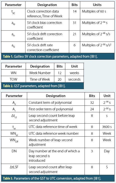 The correction between the individual space vehicle clock and GNSS system time at a given time is calculated from the transmitted parameters, here shown for Galileo in Table 1 (see inset, above right, for all tables) (European GNSS [Galileo] Open Service Signal In Space Interface Control Document, OD SIS ICD, European Union (2010), listed in Additional Resources [IB1]). The corresponding definition for GPS is given in §20.3.3.3.1.8 and the associated Table 20-1 in Global Positioning Systems Directorate Systems Engineering & Integration, Interface Specification IS-GPS-200H, listed in Additional Resources [IB2].