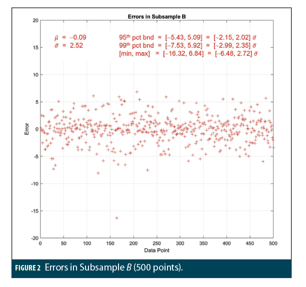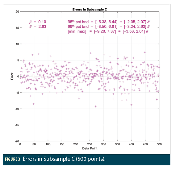 Figures 1, 2, and 3 show the results of three separate random subsamples A, B, and C, each containing 500 points from among the 10 million samples in the overall dataset R. The sample error mean, error sigma, minimum and maximum error, and upper and lower bounds at the 95th and 99th percentiles are shown on each plot along with the ratios of these quantities over the sample error sigma. For comparison, recall that the normal distribution sigma multipliers are ± 1.96 for 95% bounds, ± 2.81 for 99% bounds, and ± 3.09 for 99.8% bounds, corresponding to the minimum and maximum of 500 samples.