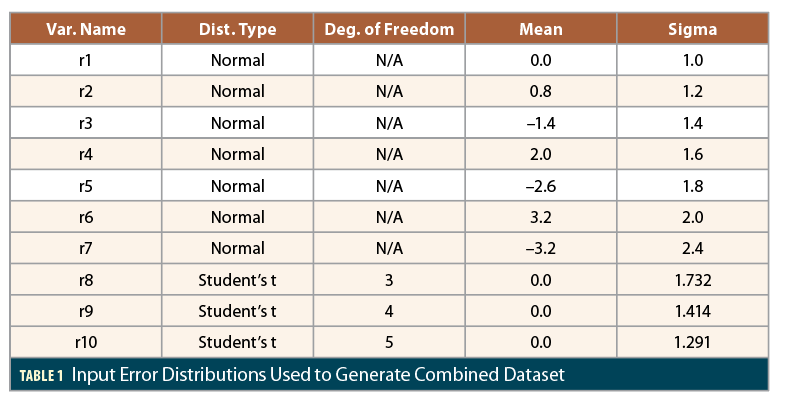 To illustrate the differences between accuracy and integrity bounding along with the empirical approach to deriving sigma inflation factors, a numerical simulation is shown here using Matlab to generate millions of samples of errors that are mostly normally distributed but suffer from the “mixing” of different distributions mentioned above. In this simulation, a total of 10 million random samples R were created by generating 1 million samples each from the 10 different error distributions r1, …, r10 shown in Table 1. Note that non-zero but offsetting (some positive, some negative) means are included, and three of the 10 distributions are non-normal “Student’s t” distributions with zero mean but fatter-than-normal tails [6].